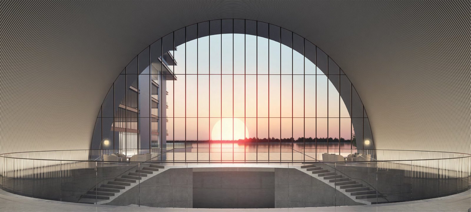 Extensive water features at ground-floor and first-floor level.