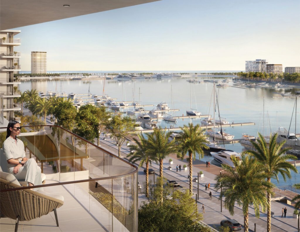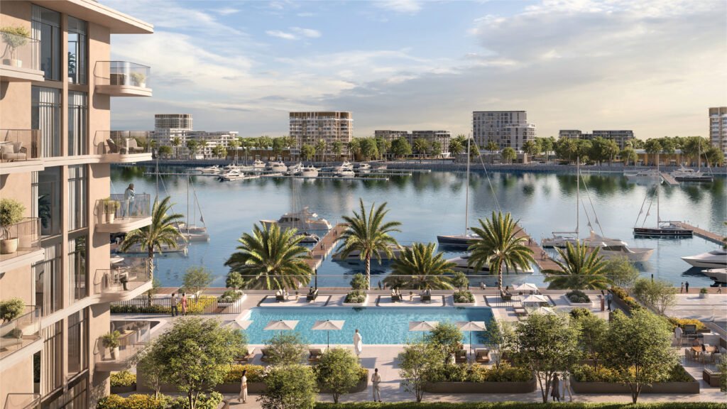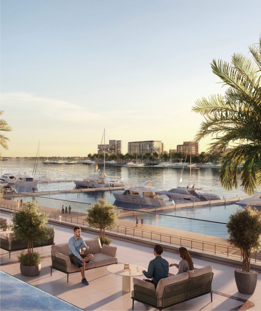 Residents have access to a marina-facing infinity pool, fitness center, children’s play areas, and multi-purpose rooms for events.